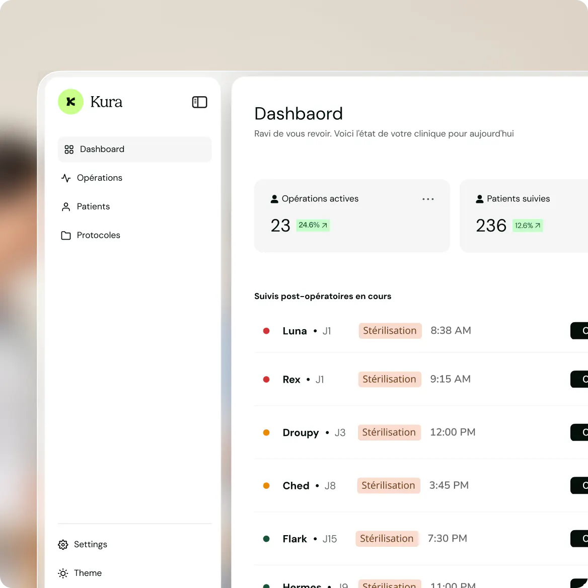 Dormez sur vos deux oreilles. Vous savez que chaque animal est surveillé selon vos propres standards cliniques. De J1 à J15, Kura assure une traçabilité absolue des constantes post-opératoires