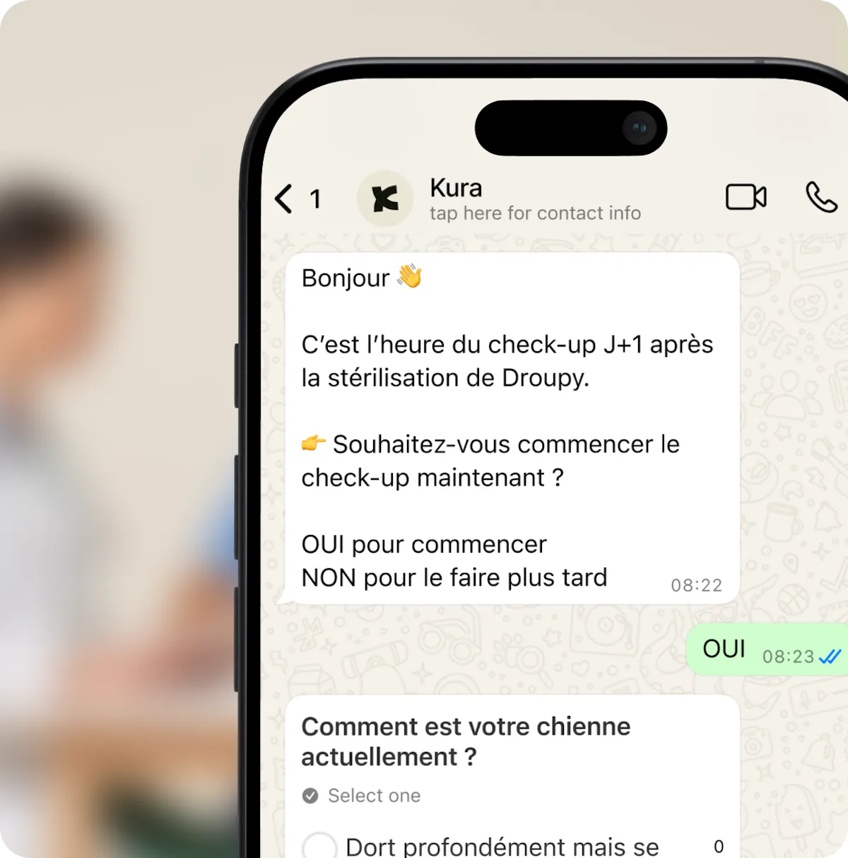Réduisez de 70% les appels répétitifs à faible valeur médicale. "Est-ce normal qu'il soit fatigué ?", "Quand retirer les fils ?" : Kura filtre les questions de confort et de logistique.
